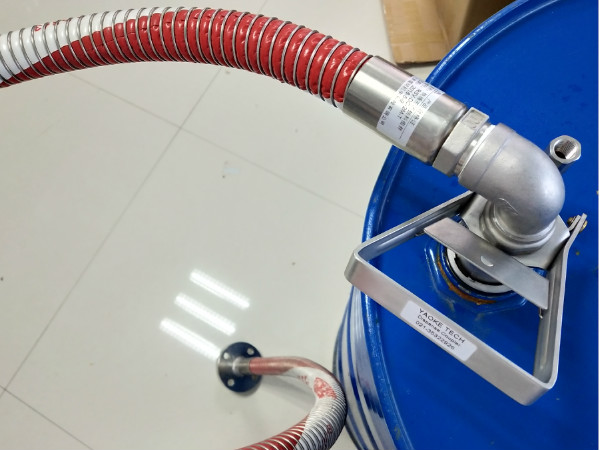 密閉抽料接頭集成進氣口與止回閥,抽料同時可補充氣體進入,桶內揮發(fā)物不能逸出,大大降低操作現(xiàn)場揮發(fā)物排放,改善工作場所健康安全條件。進氣口接氮氣等保護氣體時,能隔絕空氣、水汽等混入或沾污物料,確保抽料安全、確保物料質量。