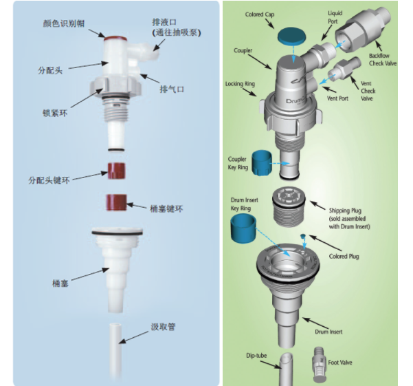 ■ 汲取管總成: 汲取管總成一般包括一個“桶塞”和一根伸到容器底部的中空“下插管”或“吸管”,“桶塞”配有一個螺紋塞,取代了標準塞孔用塞子。汲取管由桶制造商預先安裝或者由分裝商在灌裝時安裝。最終用戶也可以選擇在將容器運到最終工藝地點之前,在一個安全區(qū)域安裝汲取管。