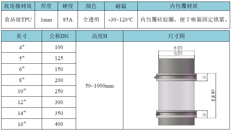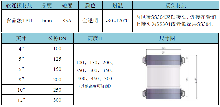 采用基于標準管道設(shè)計,通過接頭和特別設(shè)計的卡箍實現(xiàn)完美密封。采用食品級TPU薄膜精密焊接而成,做工精細平滑、密封嚴密無泄漏、耐磨抗撕裂、透明以便觀察,另外具有安裝方便、尺寸標準化、方便備件和維護等優(yōu)勢。